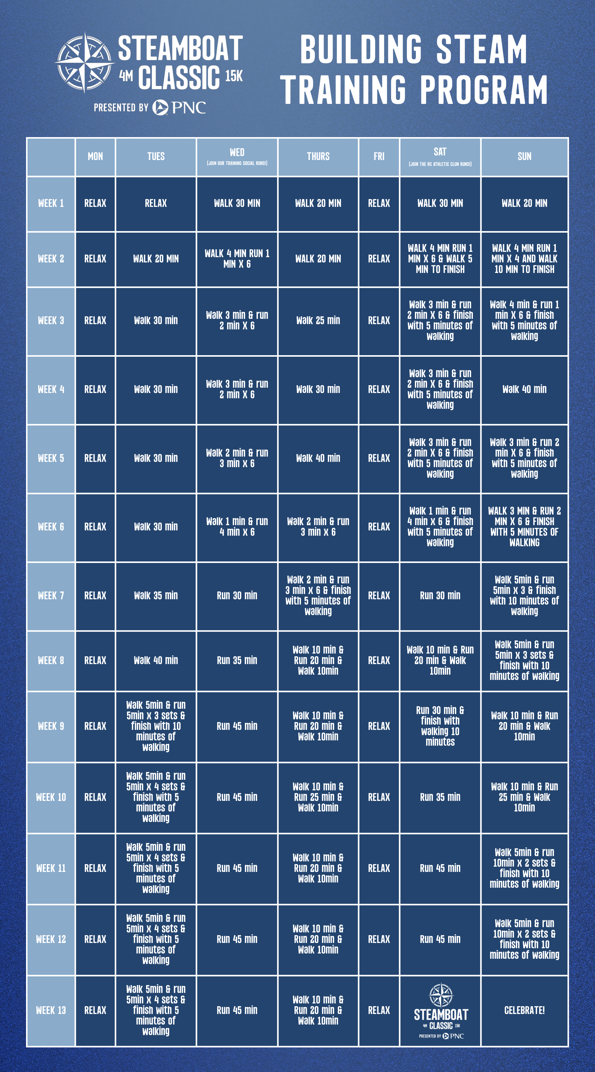 Building Steam is a beginner-friendly guide designed to get you ready for the Steamboat Classic 4 mile! With a gradual, approachable plan, it builds your endurance and confidence week by week!