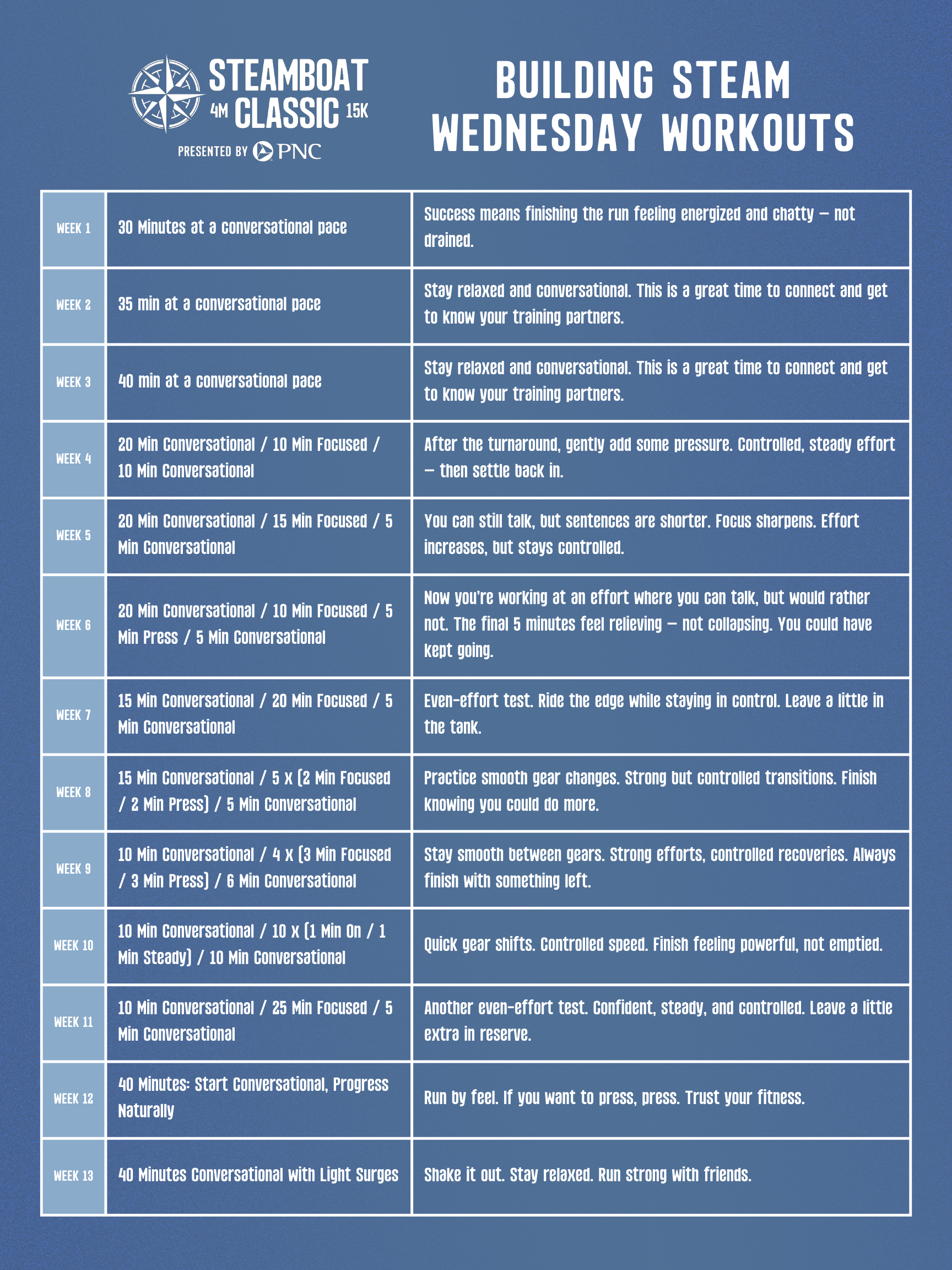 Wednesday Workouts are for runners who are comfortable covering the four miles of the Steamboat Classic and are ready to take the next step. These structured, progressive sessions give purpose to your midweek miles — building speed, strength, and confidence week by week!